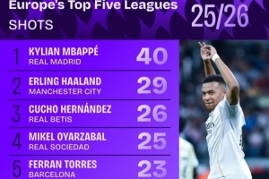 體育資訊10月17日訊 Squawka統(tǒng)計(jì)了本賽季到目前為止歐洲五大聯(lián)賽球員射門(mén)次數(shù)排行,皇馬前鋒姆巴佩40次射門(mén)排名第一,哈蘭德29次第二。