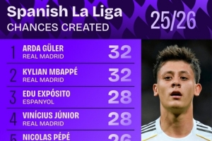 體育資訊11月12日訊 Squawka統(tǒng)計本賽季西甲創(chuàng)造機會次數,居萊爾、姆巴佩32次最多。