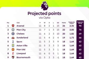體育資訊11月15日訊 本賽季英超已經(jīng)過去11輪,阿森納8勝2平1負,積26分排名聯(lián)賽第1,領(lǐng)先第二的曼城4分。