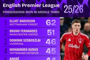 本賽季英超中場區(qū)域奪得球權(quán)排名: