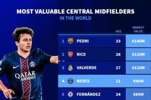 體育資訊12月13日訊 德國轉(zhuǎn)會市場統(tǒng)計了中場中路球員(CM)的德轉(zhuǎn)身價,并列出榜單,佩德里1.4億歐居首。