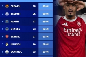 6、加布里埃爾(阿森納,27歲):7500萬歐