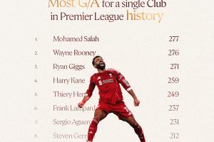 薩拉赫英超中為利物浦直接參與277球(188球,89助),超越魯尼成英超歷史中為單一俱樂(lè)部直接參與進(jìn)球最多的球員。