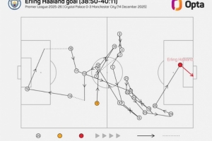 體育資訊12月15日訊 在本輪英超曼城3-0擊敗水晶宮的比賽中,哈蘭德梅開二度。