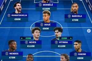 前鋒:克瓦拉茨赫利亞(巴黎圣日耳曼,9000萬)、奧斯曼·登貝萊(巴黎圣日耳曼,1億)、巴爾科拉(巴黎圣日耳曼,7000萬)