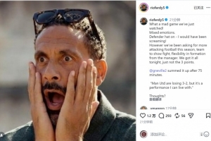 曼聯(lián)名宿費(fèi)迪南德社媒曬出自己一臉驚訝的照片,并寫道:“我們剛剛看了一場(chǎng)多么瘋狂的比賽!心情復(fù)雜。以防守球員的身份來(lái)說(shuō)——我(要是還在場(chǎng)上)肯定會(huì)大喊大叫!”