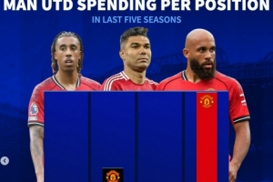 體育資訊12月16日訊 德轉(zhuǎn)盤(pán)點(diǎn)了近5個(gè)賽季曼聯(lián)在各個(gè)位置引援花費(fèi)情況,其中鋒線引援花費(fèi)明顯最多,具體如下: