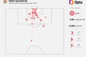25 – 卡扎伊什維利本賽季在運(yùn)動(dòng)戰(zhàn)中攻入25粒進(jìn)球,刷新自有紀(jì)錄以來(2012年),任一球員單賽季中超運(yùn)動(dòng)戰(zhàn)進(jìn)球新高。