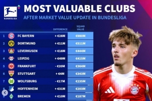 體育資訊12月19日訊 《轉(zhuǎn)會(huì)市場(chǎng)》在今日更新了德甲球員身價(jià),也統(tǒng)計(jì)了德甲各隊(duì)的最新身價(jià)情況。