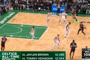 第四節(jié)比賽,杰倫·布朗通過上籃得到個人本場第30分,生涯總得分達到12196分,超越湯米·海因索恩,排名凱爾特人隊史第13位。