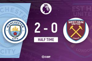 上半場(chǎng)補(bǔ)時(shí)2分鐘,曼城2-0西漢姆。