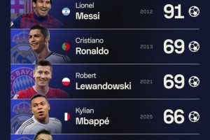 據(jù)Sofascore統(tǒng)計,姆巴佩2025年俱樂部+國家隊總計打進(jìn)66球,本世紀(jì)自然年進(jìn)球第四多。