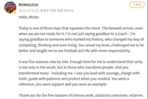今天真的是讓我感到難過,離別總是來得那么突然,讓人措手不及。我不僅僅是在向一位主教練告別,更是在向一位給我留下深刻印記的人告別,他改變了我的比賽方式、思維模式乃至日常生活。您提升了我的競技水平,激勵我變得更好,并教會我?guī)е嘭?zé)任感看待足球和生活。