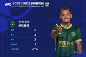 中超聯(lián)賽第15輪中,浙江俱樂部綠城客場挑戰(zhàn)青島海牛。比賽第69分鐘,浙江俱樂部綠城球員米特里策接到隊友弗蘭克的橫敲,在禁區(qū)前沿右腳推射破門;全場傷停補時階段,米特里策半場帶球突入禁區(qū)后右腳低射,皮球被牟鵬飛擋出后,他補射破門完成梅開二度;此外在比賽的第47分鐘,米特里策助攻王鈺棟遠射破門,最終浙江俱樂部綠城客場3-0取勝,米特里策在自己的中超首秀中2射1傳表現(xiàn)驚艷。