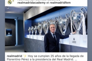弗洛倫蒂諾迎來擔(dān)任皇馬主席25周年紀(jì)念日,俱樂部社媒發(fā)文致敬,本澤馬轉(zhuǎn)發(fā)了皇馬俱樂部的社媒動(dòng)態(tài)。