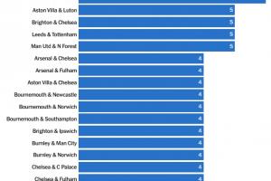 5次:維拉&盧頓、布萊頓&切爾西、利茲聯(lián)&熱刺、曼聯(lián)&森林