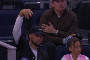 此役,勇士球星庫里攜二女兒萊恩現(xiàn)場觀戰(zhàn),并在鏡頭前互動。