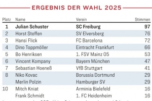 體育資訊8月11日訊 弗賴堡主帥舒斯特爾當(dāng)選2025年德國最佳教練,《踢球者》公布得票詳情,舒斯特爾97票居首,斯蒂芬、弗里克二三位。